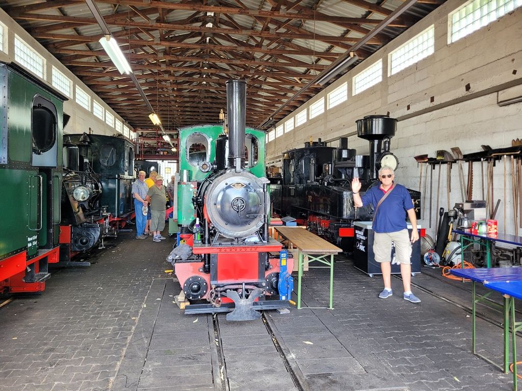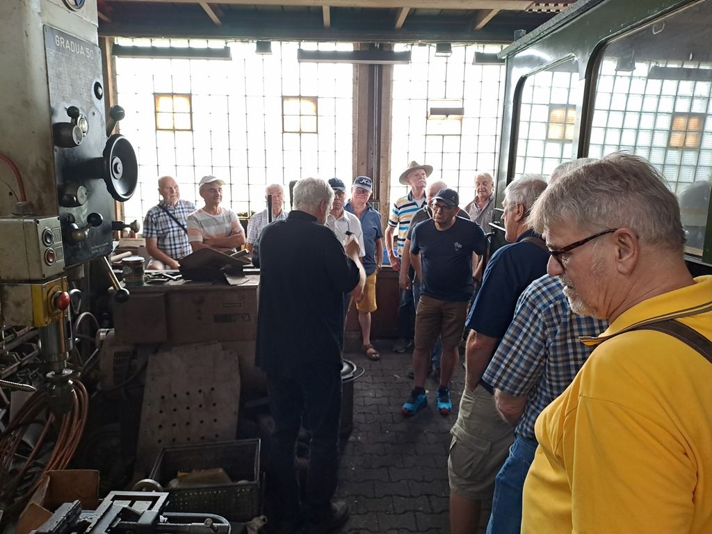 Das ist doch was! Die Jedermänner der Turngesellschaft Hausen starteten bei sonnigem(heißen) Wetter zum Rebstock Gelände nach Frankfurt und besuchten das Feldbahnmuseum. Die Führung übernahm der stellv. Leiter des Museums, ist er doch zufällig ein ehemaliger Arbeitskollege einer unserer Jedermänner. Ausführlich gab er einen Überblick über die mehr als 70 stationierten Lokomotiven. Das ganze gespickt mit Anekdoten sowohl zu den einzelnen Locks als auch aus der Gründungzeit des Museums seit 1985 bis heute und gleichzeitig hatte er Geduld alle Fragen zu beantworten.