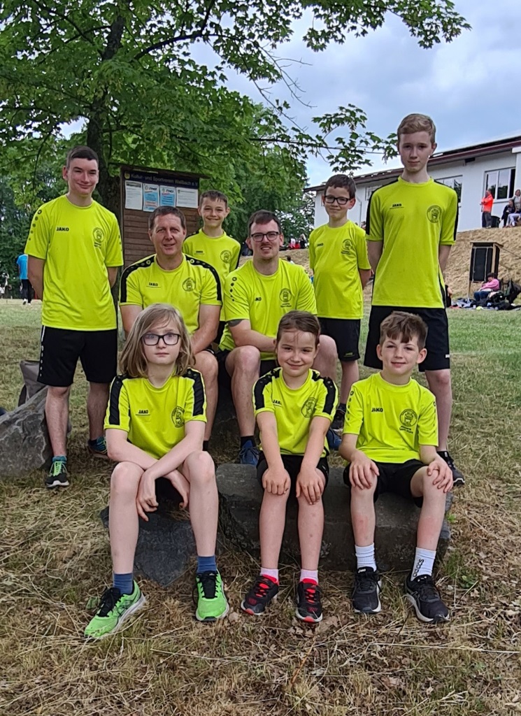 Dem Wettkampf an diesem Tag stellten sich Carsten Liebe, Katrin Rackelmann-Silber, Bastian Soutschek, Johannes Büttner, Hendrik Zimmermann, Felix Salzmann, Christopher Rackelmann, Malte Zimmermann, Lewis Mellinger und Magdalena Rackelmann. Ihre Wettkampfpremiere feierten mit Johannes, Lewis und Magdalena drei Sportler auf einmal. Alle Kinder und Jugendlichen absolvierten den Bergfest Dreikampf. Bergfestsieger in der Altersklasse M12 wurde Felix Salzmann. Felix absolvierte in seinem Dreikampf einen 75m Sprint, Weitsprung und Ballwurf. Beim Sprint zeigte er mit 12,3sec eine gute Zeit. Beim Weitsprung ersprang er sich eine Weite von 3,45m und warf zum ersten Mal in einem Wettkampf den 200g Ball auf sehr gute 33,00m. Am Ende stand damit der 1. Platz für Felix fest. Den zweiten und dritten Platz in der Altersklasse (AK) M14/M15 errangen Johannes und Hendrik. Dieser Dreikampf bestand aus einem 85m Sprint, Weitsprung und Kugelstoßen. Johannes zeigte beim Sprint eine klasse Zeit von 12,2sec. Beim Kugelstoßen erzielte Johannes mit der 4kg Kugel eine Weite von 6,05m. Beim Weitsprung hatte Johannes leichte Probleme mit der Anlage und ersprang sich hier eine Weite von 3,46m. Am Ende stand für Johannes ein toller 2. Platz bei seiner Wettkampfpremiere. Hendrik zeigte vor allem beim Weitsprung eine starke Leistung mit tollen 4,50m und neuer persönlicher Bestleistung. Beim Kugelstoßen erreichte Hendrik 6,38m. Beim 85m Sprint geriet Hendrik durch eine Unebenheit im Boden kurz vor dem Ziel aus dem Tritt, vermied aber den Sturz und holte trotzdem noch eine Zeit von 14,5sec. Am Ende stand Hendrik mit dem 3. Platz trotzdem auf dem Podest. In der M11 gingen mit Christopher und Malte ebenfalls zwei Sportler an den Start. Die Jungs starteten in ihrem Dreikampf im 50m Sprint, Weitsprung und Ballwurf. Christopher zeigte seine beste Leistung an diesem Tag im 80g Ballwurf mit 32,80m und stellte auch eine neue persönliche Bestleistung auf. Beim Weitsprung erreichte Christopher eine Weite von 3,15m und ersprintete sich eine Zeit von 9,4sec beim 50m Sprint. Am Ende des Wettkampfs bedeutete das den 3. Platz für Christopher. Malte errang in dieser Altersklasse den 5. Platz. Malte zeigte seine beste Leistung an diesem Tag im Sprint mit einer 9,0sec auf 50m. Die Sprintzeit wurde per Hand gestoppt, sodass dies eine neue persönliche Bestleistung bei Handstoppung bedeutete. Beim Ballwurf warf er dann den Schlagball auf 22,90m und sprang beim Weitsprung 2,95m. In der M9 feierte Lewis seine Premiere und verpasste das Podest knapp auf dem 4. Platz. Sein Dreikampf bestand ebenfalls aus 50m Sprint, Weitsprung und Ballwurf. Beim Ballwurf warf Lewis seinen weitesten Wurf auf 20,70m. Beim Weitsprung verbesserte sich Lewis in jedem Sprung und hatte am Ende eine Weite 2,75m stehen. Beim 50m Sprint hatte Lewis leichte Probleme beim Start, aber konnte dennoch mit einer Zeit von 10,4sec überzeugen. Aufs Treppchen schaffte es Magdalena in ihrem ersten Leichtathletik Wettkampf in der W8 mit dem 3. Platz. Auch sie hatte den Dreikampf mit 50m Sprint, Weitsprung und Ballwurf zu absolvieren. Beim Weitsprung war Magdalena zu Beginn noch unsicher aber steigerte sich auch hier am Ende auf eine gute Weite mit 2,35m. Beim Ballwurf warf sie dann den 80g Schlagball auf 11,10m. Im ersten 50m Sprint überhaupt erreichte Magdalena eine Zeit von 10,7sec.