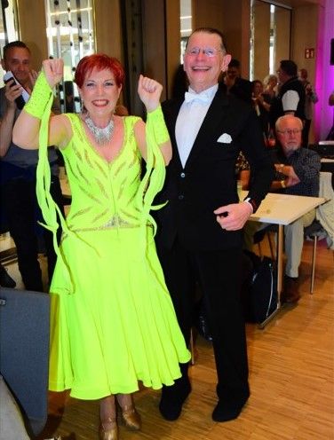 Die Generalprobe war dann ein Turnier am 23. September in Kelkheim. Reinhard und Karin haben sich gemeldet, mit dem flauen Gefühl im Magen „hält der Fuß durch“. In Kelkheim war es ein kleines aber feines Feld von 9 Paaren. Das hieß, Vor- und hoffentlich Endrunde. Die vielen mitgereisten Schlachtenbummler haben Reinhard und Karin mit ihrem Applaus so gut unterstützt und Mut gemacht, dass beide mühelos ins Finale gekommen sind. Damit nicht genug. Sie konnten sogar alle Tänze für sich entscheiden und haben das Turnier gewonnen ! Welch ein Ergebnis nach so langer Pause. Damit haben Reinhard und Karin nicht gerechnet und sind deshalb auch über-glücklich. Vor der Pause das Turnier gewonnen – nach der Pause ein Sieg. So können beide sehr gut vorbereitet das große Ziel, die Weltmeisterschaft im Oktober, angehen.