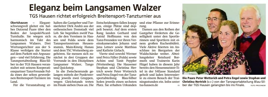 Die Tänzer aus dem Breitensportbereich trafen sich, um das erste von zwei Turnieren dieser Serie zu absolvieren. Getanzt wurde in der Altersgruppe ab 35 Jahre die Standardtänze Langsamer Walzer, Tango und Quickstep. Über eine Vor- und Zwischenrunde wurde der Sieger des Turniers ermittelt. Der Wettbewerb fand in der großen Halle der TGS Hausen statt. Zuschauer waren bei kostenlosen Eintritt herzlich willkommen. Eine gute Gelegenheit sich bei Kaffee und Kuchen einen Einblick in diese schöne Sportart zu verschaffen.