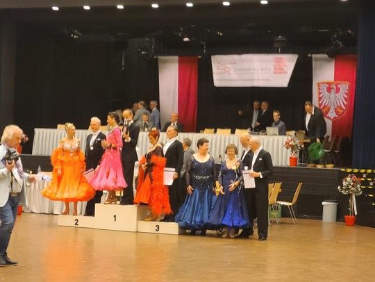 Tagesform die Überraschung, sich in allen fünf Tänzen gegen die mitfavorisierten Dieter und Elke Müller (TC Blau-Orange Wiesbaden) durchsetzen zu können. Auf Platz drei – der lediglich durch einen vierten Platz im Slowfox getrübt wurde – folgten Thomas und Hanna Owesny (TSC Schwarz- Weiß-Blau TSG Nordwest, Frankfurt). Roland und Marina Schnicke (TSC Barbarossa Biebergemünd) belegten zwar den dritten Platz im Slowfox, allerdings Platz sechs im Wiener Walzer und den vierten in den übrigen Tänzen, so dass am Ende auch der Platz vier im Gesamtergebnis herauskam. Auf Platz fünf folgten Manfred und Traudel Dort (Gießener Tanz-Club 74), die lediglich im Wiener Walzer auf Platz vier lagen. Den sechsten Finalplatz mit einem fünften Platz im Wiener Walzer ertanzten sich Edgar und Renate Bugenhagen (TSC Rot-Weiss Viernheim).