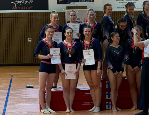 Besonders glänzen konnte Jana, die sich mit 60,95 Punkten und vier sauber geturnten Übungen den Tagesgesamtsieg erturnte. In einem Starterfeld mit 30 Turnerinnen setzte sie somit nochmal ihr ganz persönliches Highlight an diesem ohnehin schon sehr besonderen Wettkampftag. Auch für Celina dürfte der Wettkampf noch lange in Erinnerung bleiben: Für sie war es der erste Wettkampf in der „Oldies“-Mannschaft der TGS. Sie unterstützte die Mannschaft am Balken und kann sehr stolz auf ihre Leistung sein. Da die TGS mit sechs Turnerinnen an den Start ging, aber nur jeweils fünf an einem Gerät turnen mussten, musste nicht jede Turnerin an jedem Gerät starten. Der Regionalentscheid gehört zu den wenigen Wettkämpfen, die über den Turngau hinaus ausgetragen werden. Für alle Teilnehmerinnen war es somit ein nicht alltäglicher Wettkampf und eine besondere Herausforderung. Umso erfreulicher, dass die Mannschaft mit der Silbermedaille nach Hause gehen konnte.