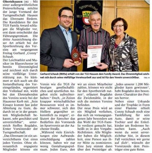 Gerhard Schaub, der Leichtathlet und Musiker beim Blasorchester wurde für den diesjährigen Family Award ausgewählt.