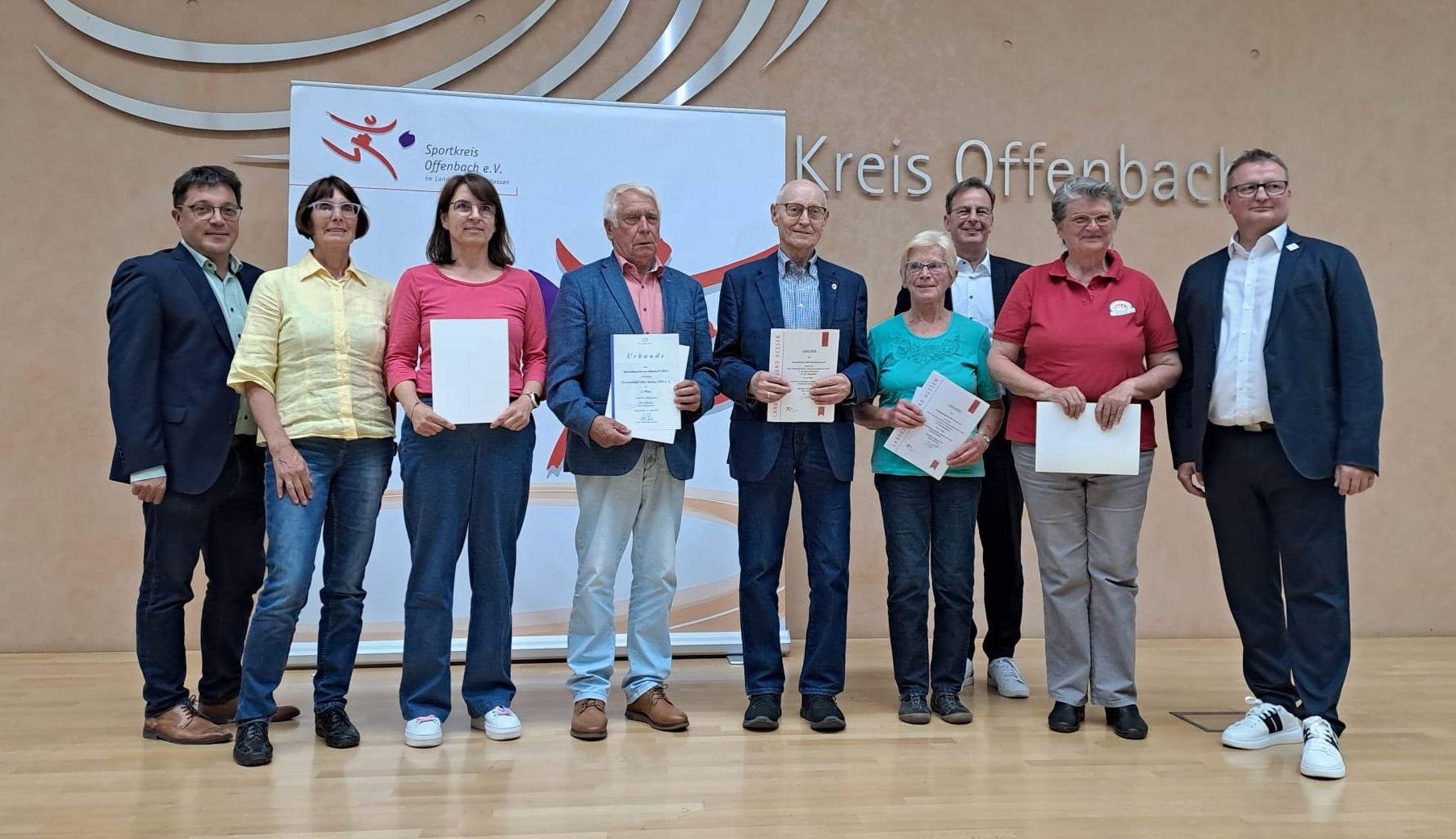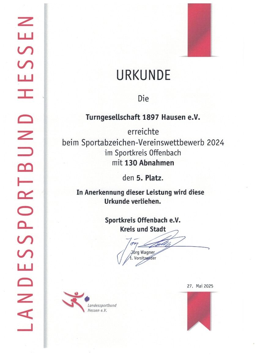 Beim Sportabzeichenehrenabend des Sportkreises Offenbach in Dietzenbach wurde die Turngesellschaft Hausen für den 5. Platz mit 130 Abnahmen beim Sportabzeichen-Vereinswettbewerb 2024 geehrt. Damit konnte sich die TGS Hausen nach dem 6. Platz im Vorjahr wieder steigern und zum wiederholten Mal einen Platz unter den besten fünf Vereinen im Sportkreis Offenbach belegen. Die 130 Sportabzeichen wurden von jeweils