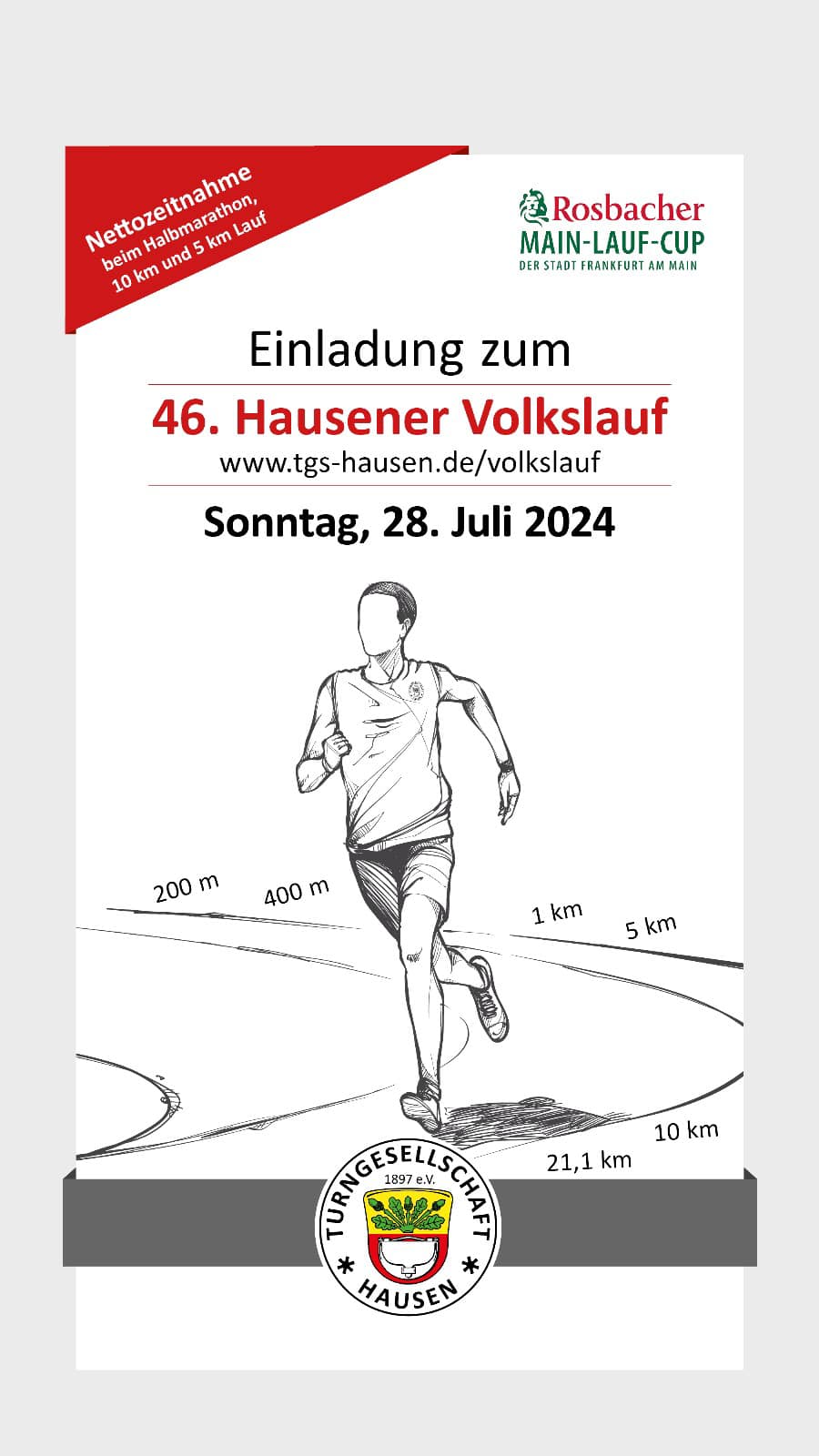 Toller Wettkampftag bei bestem Laufwetter Auch in diesem Jahr war der Hausener Volkslauf wieder ein voller Erfolg. Etwas über 650 Läuferinnen und Läufer aus nah und fern hatten sich am 28. Juli 2024 bei überwiegend sonnigem Himmel und sehr angenehmen Temperaturen im Rahmen der Rosbacher Mainlauf-Serie rund um Sportgelände und Wald der TGS in unterschiedlichen Distanzen und Altersklassen gemessen. Halbmarathon-Start: Am frühen Sonntagmorgen gingen im 21,1-km-Halbmarathon 187 Läuferinnen und Läufer, unter ihnen auch Bürgermeister Manuel Friedrich, an den Start. Der 10-km-Volks-Waldlauf war der zahlenmäßig stärkste Wettbewerb mit 294 Teilnehmenden. Den 5-km-Jedermannslauf absolvierten 66 Aktive. Am späteren Vormittag waren die Kinder und Jugendlichen an der Reihe: Am 1- km-Lauf nahmen 51 Mädchen und Jungen teil. Den 400-m-Lauf gewann bei den Jungen unser Mitglied Ben Bachmaier unter 18 Kindern. Großer Beliebtheit erfreute sich wieder der 200-m-Lauf der Kleinsten – dort absolvierten 37 Kinder ihren zumeist ersten Laufwettbewerb, frenetisch angefeuert von ihren Eltern und Geschwistern.